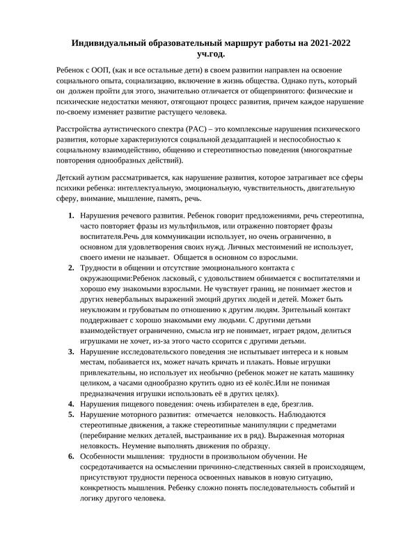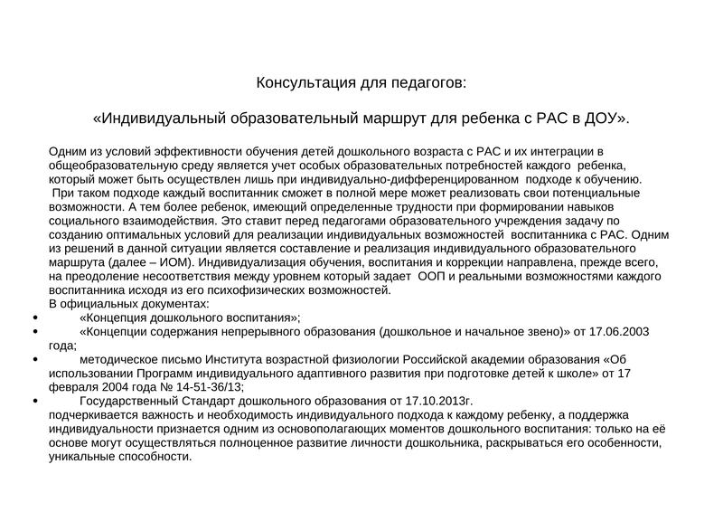 «Индивидуальный Образовательный Маршрут Для Ребенка С Рас В Доу»