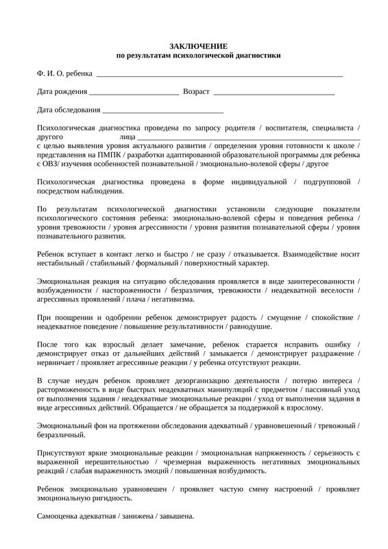 Универсальная Форма Заключения По Результатам Психологической Диагностики